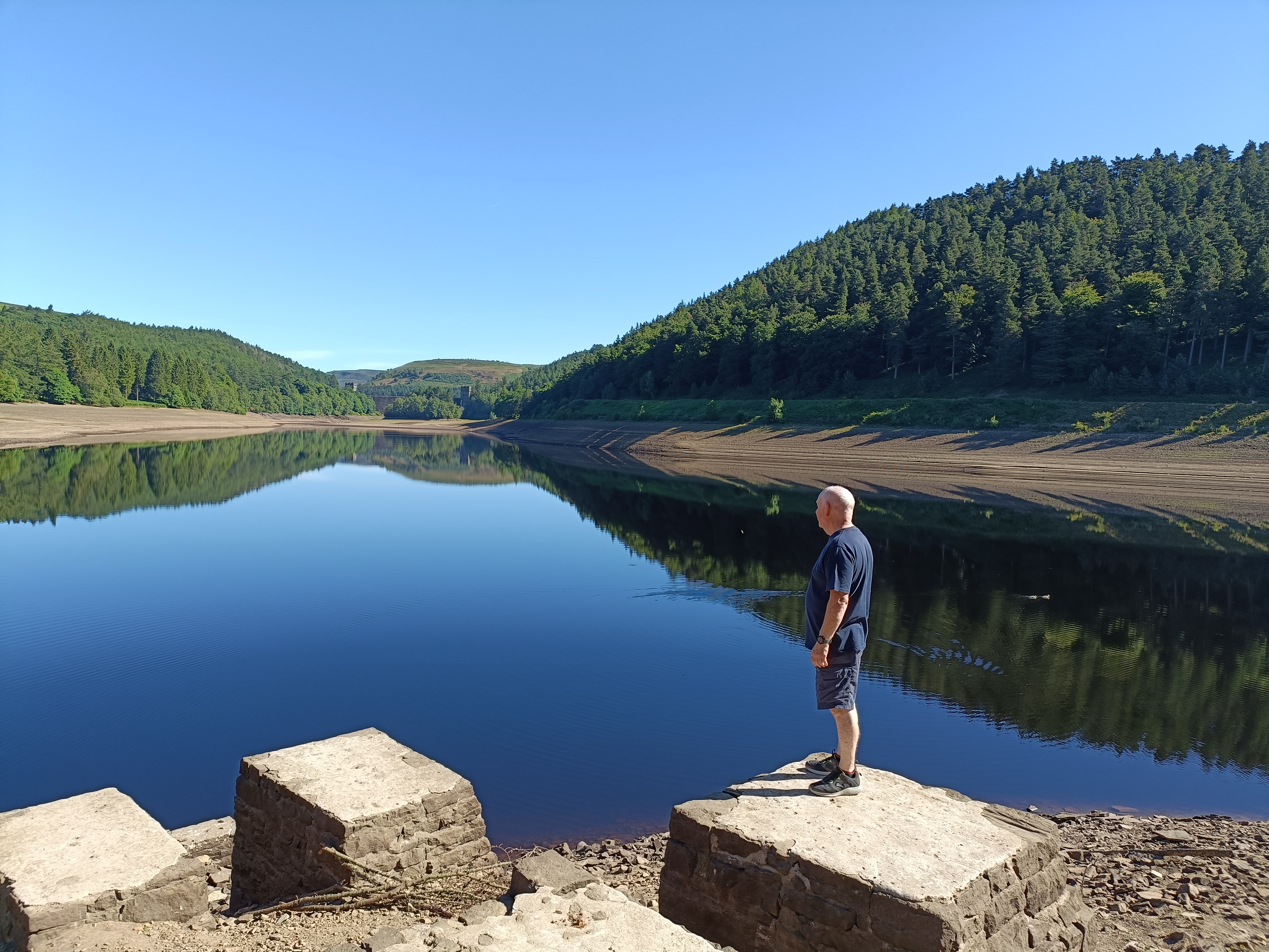 The abutments on the edge of the Derwent Reservoir are the remains of the railway bridge used to transport building materials to the Howden dam further upstream. Usually the water is much deeper, particularly during winter. But in early July 2022 the water levels were low, and getting lower.